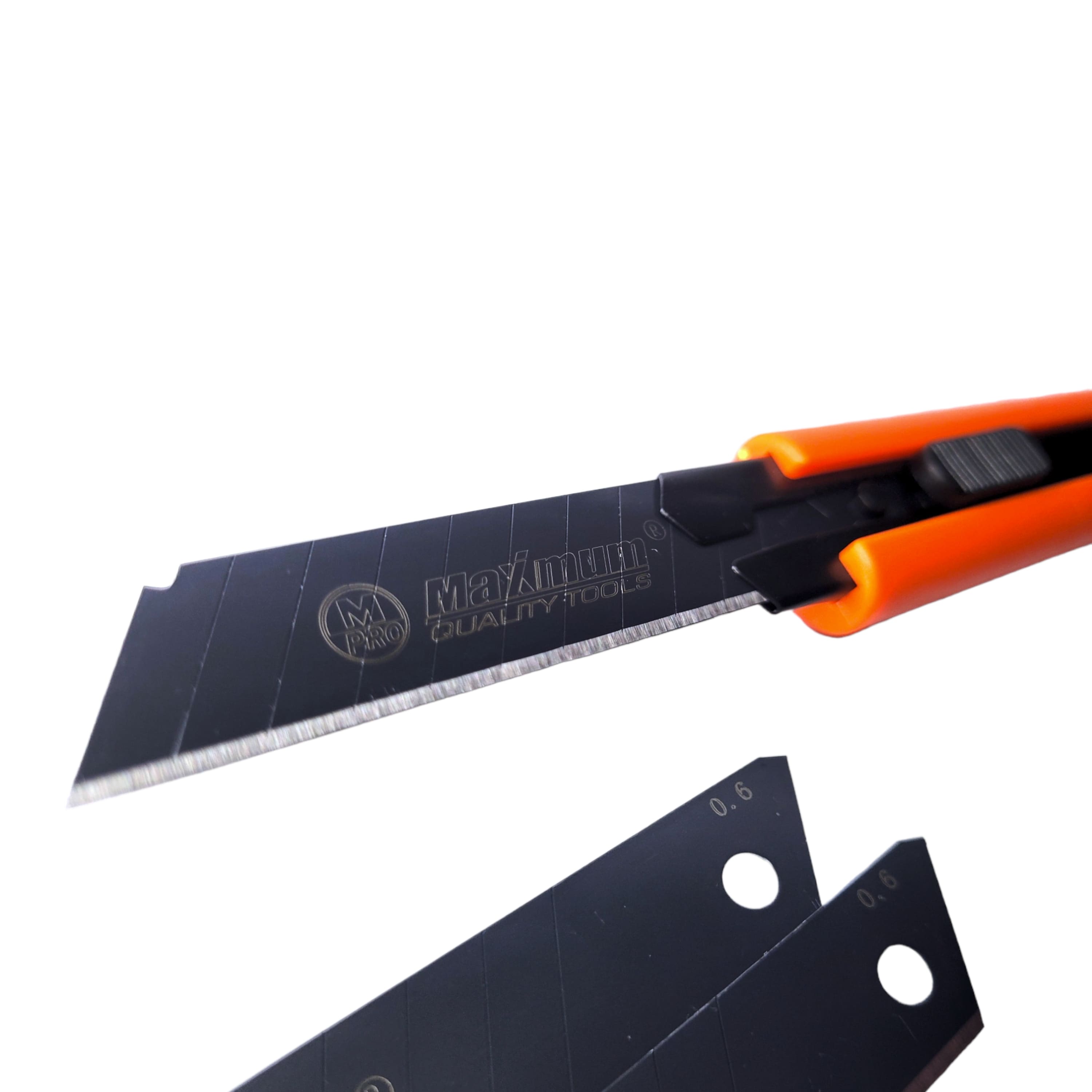 Нож канцелярский/строительный с кнопкой фиксации от "Maximum Quality Tools" предназначен для разрезания гипсокартона, бумаги, обоев, картона, ковролина, линолеума и т.п. Стильный пластиковый корпус выпускается в 3 цветах и дополнен металлической направляющей, а также отсеком для запаски. Общая длина ножа 160 мм, ширина 30 мм. Усиленный канцелярский нож поставляется с 3мя чернеными лезвиями толщиной 0.6 мм.