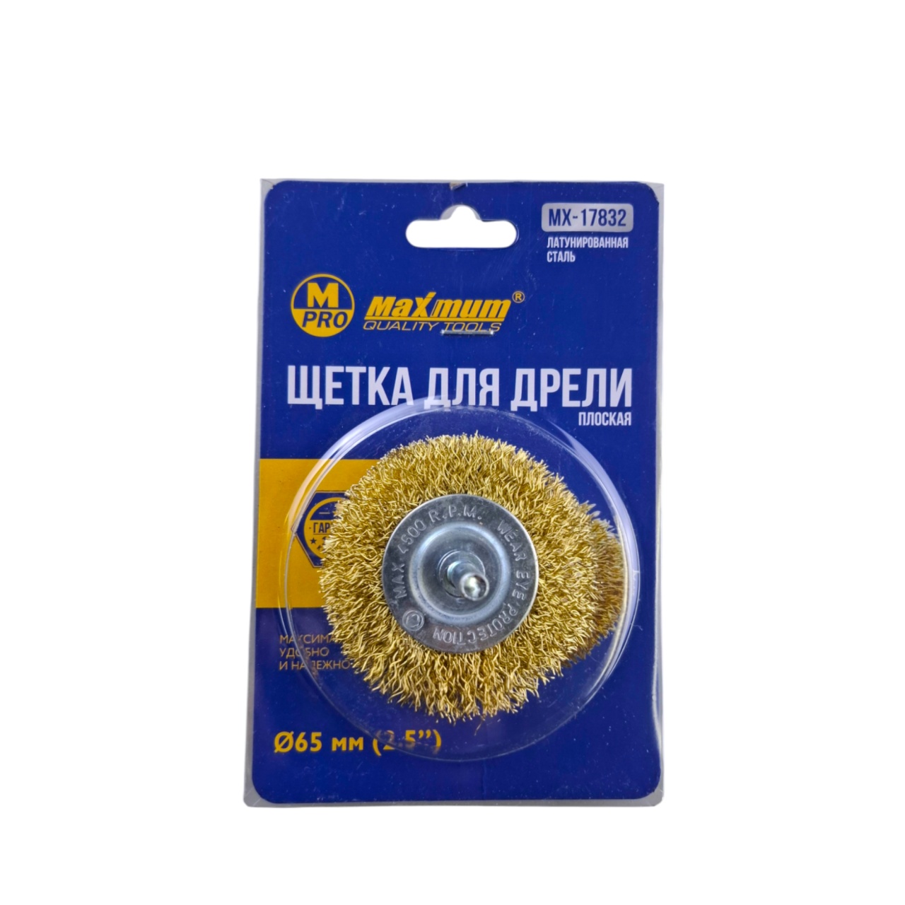 Щетка плоская с проволочной латунированной щетиной 65 мм от "MAXIMUM QUALITY TOOLS" крепится на дрель или шуруповерт через резьбовую шпильку 6 мм.