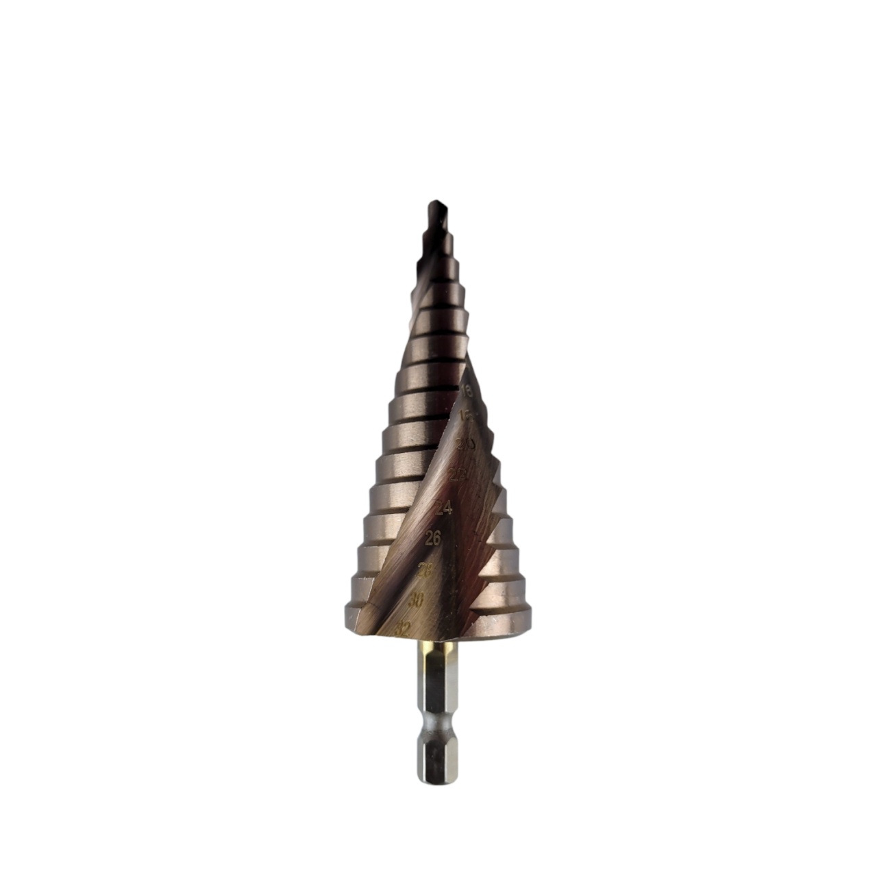 Ступени имеют удобную маркировку фактического диаметра. Предназначено для получения отверстий различного диаметра в листовых материалах без перестановки режущего инструмента. Сверло изготовлено из быстрорежущей стали, благодаря чему служит длительное время и работает с высокой скоростью.